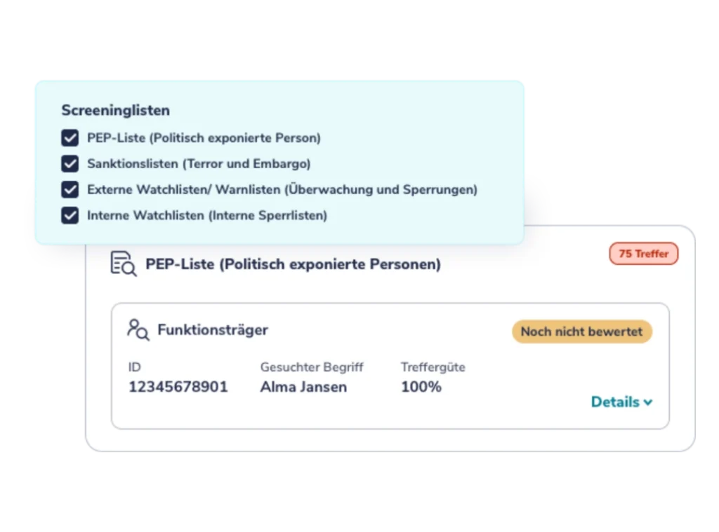 Das AML-Screening-Modul von KYCnow prüft automatisiert gegen 1.200 internationale Sanktions- und Watchlisten, erkennt PEPs samt Risikoeinstufung und überwacht relevante Änderungen. KI-gestütztes Adverse Media Screening sorgt zusätzlich für maximale Sicherheit.