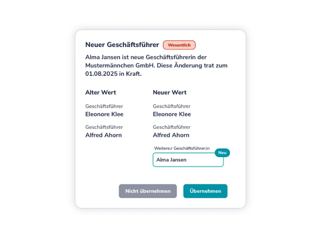 Das KYC-Monitoring-Modul aktualisiert Ihre KYC-Daten automatisch aus Registern, Auskunfteien und offiziellen Quellen. Relevante Änderungen bei UBOs, Funktionsträgern oder Gesellschaftern werden sofort angezeigt.